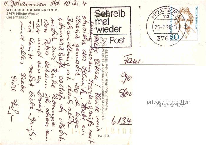 72835140 alte Postkarte Hoexter Weser Weserberglandklinik Fliegeraufnahme postalisch gelaufen Erhaltung siehe scans [FriedD77] KatCode: 11110005762020