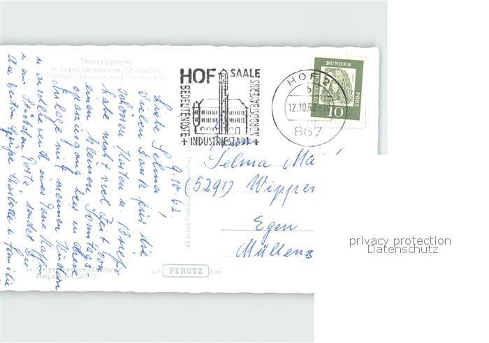 72181312 alte Postkarte Hof Saale Fliegeraufnahme Theresienstein postalisch gelaufen Erhaltung siehe scans KatCode: 11110009464000