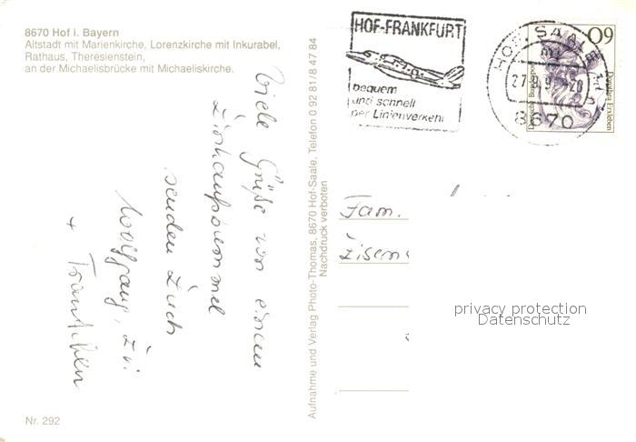 73295829 alte Postkarte Hof Saale Fussgaengerzone Kirchen Schloss postalisch gelaufen Erhaltung siehe scans [WerneD78] KatCode: 11110009464000