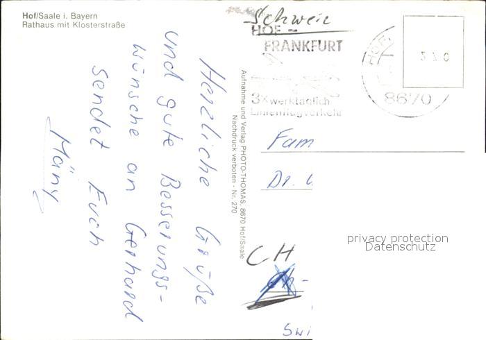 72557570 alte Postkarte Hof Saale Rathaus Klosterstrasse postalisch gelaufen Erhaltung siehe scans [KathaD79] KatCode: 11110009464000