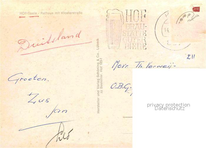 72895382 alte Postkarte Hof Saale Rathaus mit Klosterstrasse postalisch gelaufen Erhaltung siehe scans [WerneD78] KatCode: 11110009464000