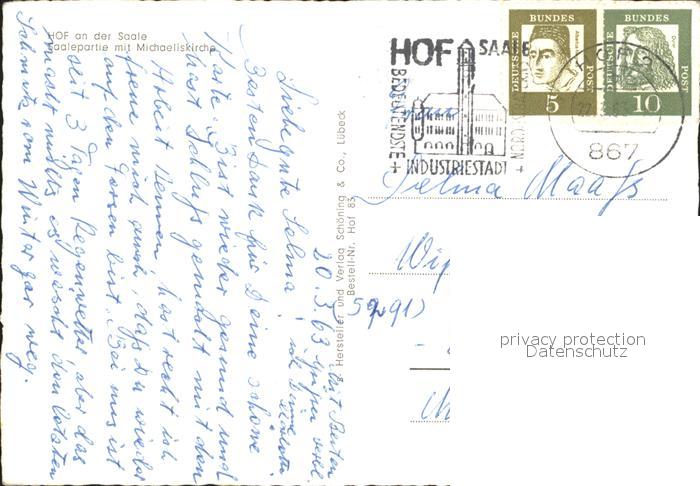 72142825 alte Postkarte Hof Saale Saalepartie mit Michaeliskirche postalisch gelaufen Erhaltung siehe scans KatCode: 11110009464000
