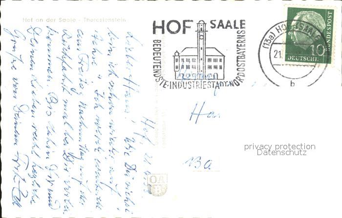 72463904 alte Postkarte Hof Saale Theresienstein postalisch gelaufen Erhaltung siehe scans KatCode: 11110009464000