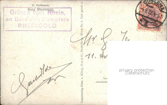 alte Postkarte Hoffmann Heinrich Burg Rheinstein postalisch gelaufen Erhaltung siehe scans
