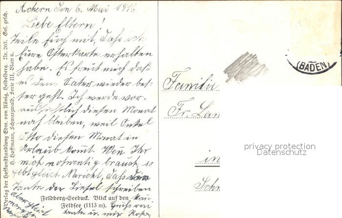 alte Postkarte Hoffmann Heinrich Feldberg-Seebuck Feldsee postalisch gelaufen Erhaltung siehe scans