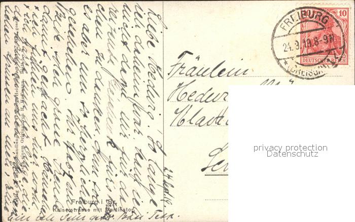 alte Postkarte Hoffmann Heinrich Freiburg im Breisgau Kaiserstrasse Martinstor postalisch gelaufen Erhaltung siehe scans