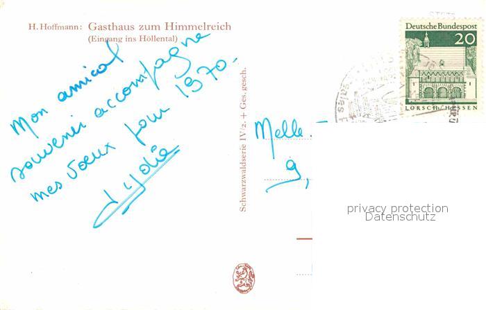alte Postkarte Hoffmann Heinrich Gasthaus zum Himmelreich Eingang ins Hoellental postalisch gelaufen Erhaltung siehe scans [PaolaD17]