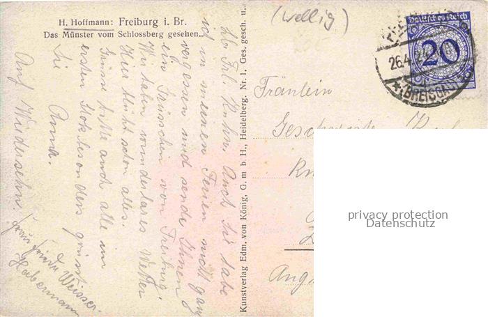 74011806 alte Postkarte HOFFMANN Heinrich Kuenstlerkarte Freiburg i. Br. Das Muenster vom Schlossberg gesehen postalisch gelaufen Erhaltung siehe scans [IrynaD87] KatCode: 22241000001600