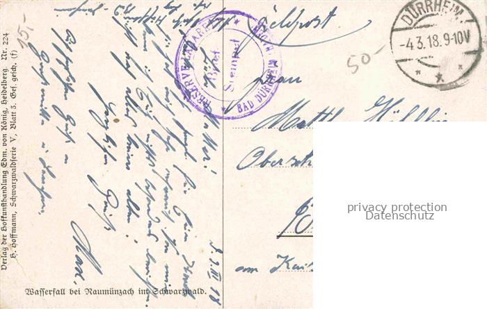 74005529 alte Postkarte Hoffmann Heinrich Kuenstlerkarte Sueddeutschland Alsace Wasserfall bei Raumuenzach Schwarzwald postalisch gelaufen Erhaltung siehe scans [IrynaD87] KatCode: 22240000001600