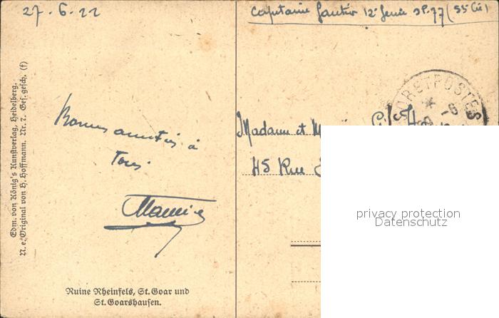 alte Postkarte Hoffmann Heinrich Ruine Rheinfels St. Goar St. Goarshausen postalisch gelaufen Feldpost Erhaltung siehe scans