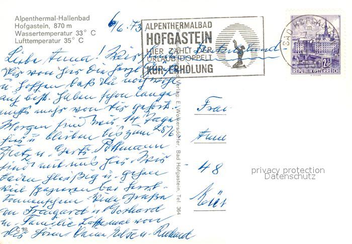 73049066 alte Postkarte Hofgastein Alpenthermal Hallenbad postalisch gelaufen Erhaltung siehe scans [KathaD81] KatCode: 11390322050402