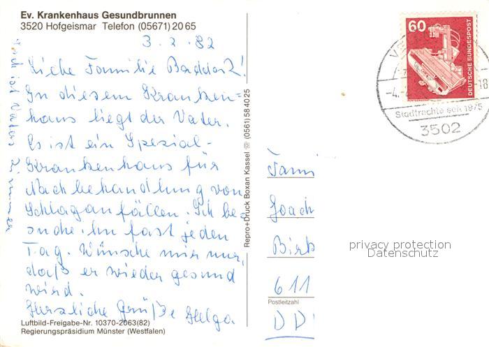 73162885 alte Postkarte Hofgeismar Krankenhaus Gesundbrunnen Fliegeraufnahme postalisch gelaufen Erhaltung siehe scans [FriedD77] KatCode: 11110006633013