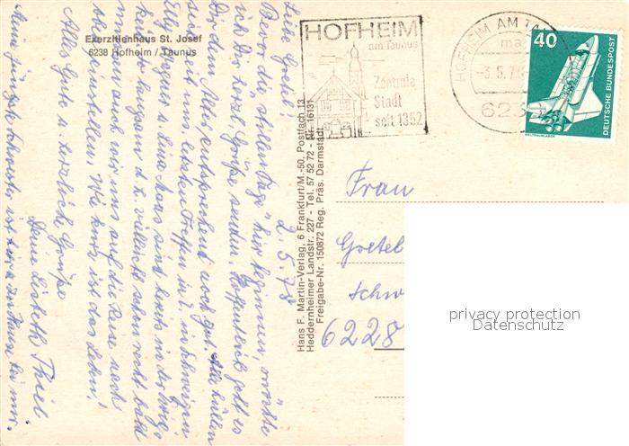 73125294 alte Postkarte Hofheim Taunus Exerzitienhaus St. Josef postalisch gelaufen Erhaltung siehe scans [NatalD47] KatCode: 11110006436007