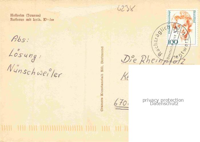 74155027 alte Postkarte Hofheim Taunus Hessen Rathaus mit katholischer Kirche Altstadt Hotel postalisch gelaufen Erhaltung siehe scans [FriedD77] KatCode: 11110006436007