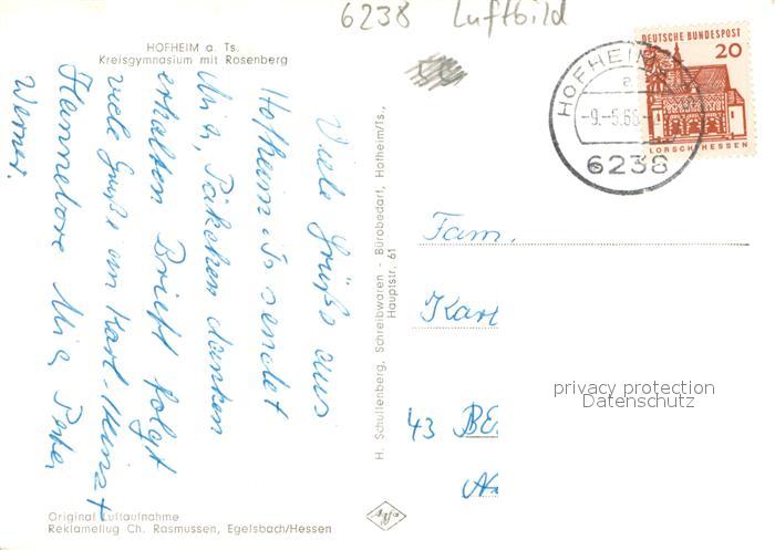 73749548 alte Postkarte Hofheim Taunus Kreisgymnasium mit Rosenberg Fliegeraufnahme postalisch gelaufen Erhaltung siehe scans [WerneD78] KatCode: 11110006436007