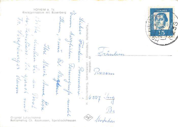 73974409 alte Postkarte Hofheim Taunus Kreisgymnasium mit Rosenberg postalisch gelaufen Fliegeraufnahme Erhaltung siehe scans [FriedD77] KatCode: 11110006436007