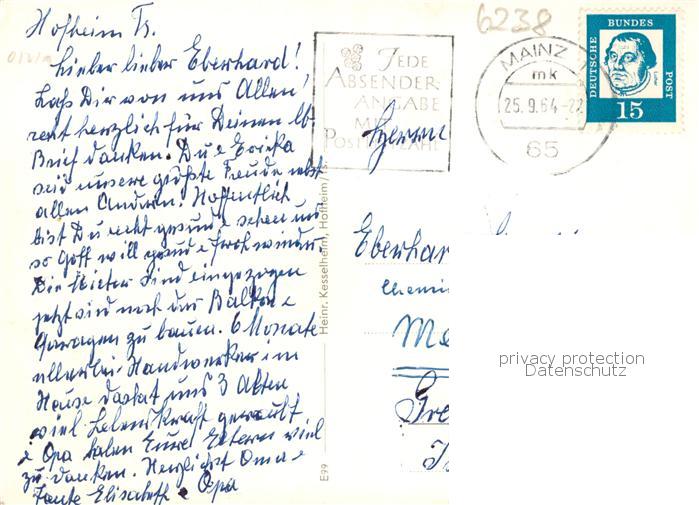73868040 alte Postkarte Hofheim Taunus St Marienkrankenhaus Seitenansicht Ev Feierabendheim Pfingstweide Rathaus Partie am Schwarzenbach postalisch gelaufen Erhaltung siehe scans [WerneD78] KatCode: 11110006436007