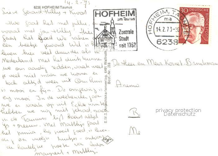 73228346 alte Postkarte Hofheim Taunus Teilansicht Strassenpartie Rathaus Kirche Exerzitienhaus Gymnasium Tempel Langenhain postalisch gelaufen Erhaltung siehe scans [FriedD77] KatCode: 11110006436007