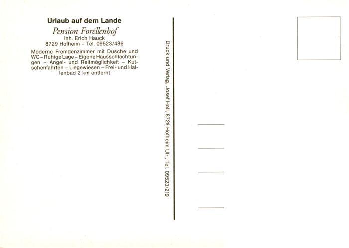 73880788 Hofheim Unterfranken Urlaub auf dem Lande Pension Forellenhof Reiten Freibad postalisch nicht gelaufen Erhaltung siehe scans [FriedD77] KatCode: 11110009674149