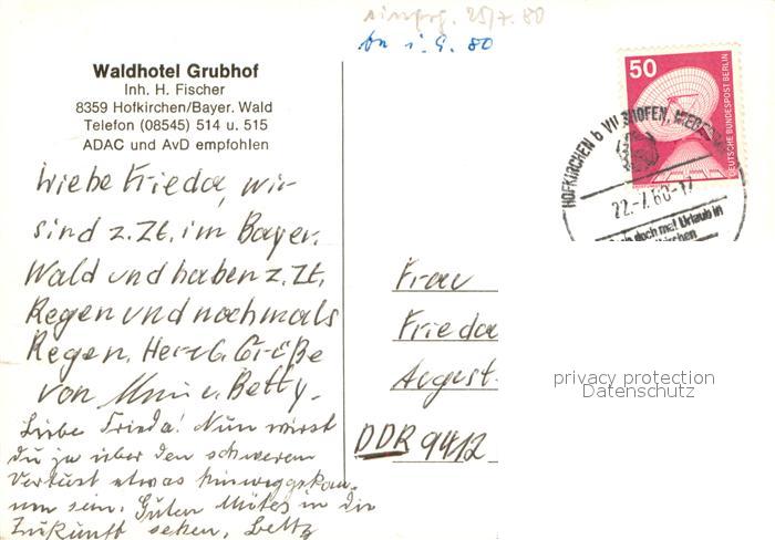 73654278 alte Postkarte Hofkirchen Donau Waldhotel Grubhof postalisch gelaufen Erhaltung siehe scans [WerneD78] KatCode: 11110009275127