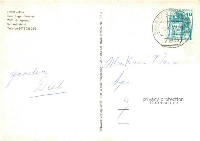 74085247 alte Postkarte Hofsgrund Oberried Schauinsland Hotel Hof postalisch gelaufen Erhaltung siehe scans [WerneD78] KatCode: 11110008315084