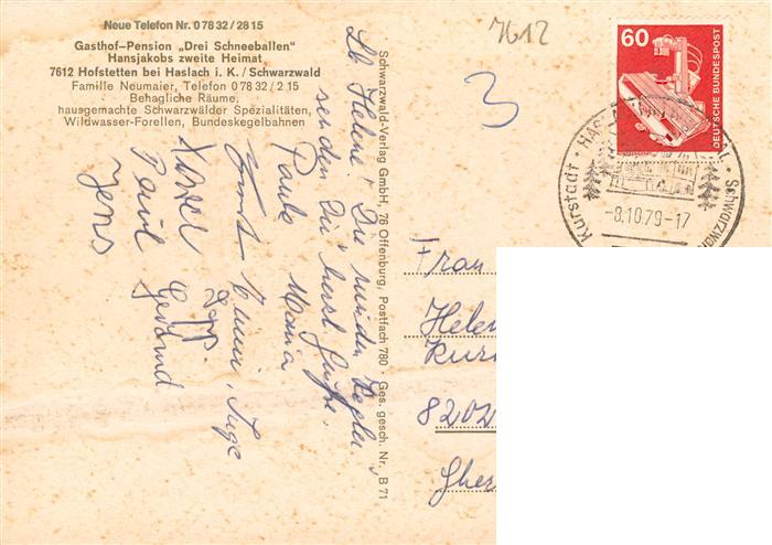 73927664 Hofstetten Haslach Kinzigtal Gasthof Pension Drei Schneeballen Gastraeume Kegelbahn postalisch gelaufen Erhaltung siehe scans [WerneD78] alte Postkarte Wern Katcode 11110008317046