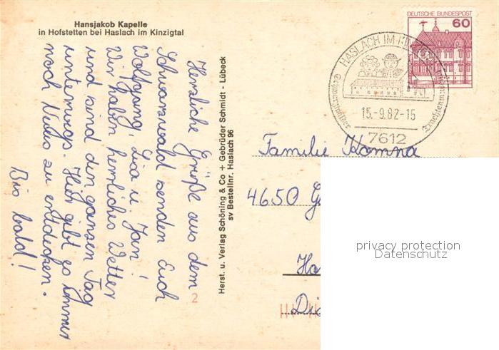 73129421 alte Postkarte Hofstetten Kinzigtal Hansjakob Kapelle postalisch gelaufen Erhaltung siehe scans [PaolaD17] KatCode: 11110008317046