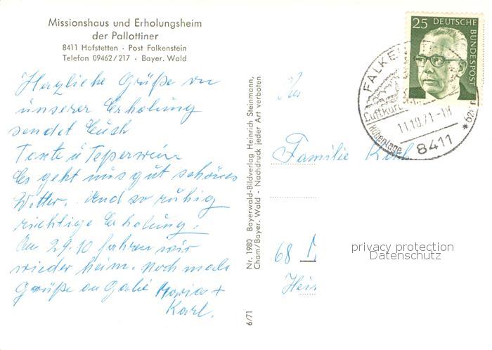 73785047 alte Postkarte Hofstetten Straubing Missionshaus-Erholungsheim der Pallottiner postalisch gelaufen Erhaltung siehe scans [LiesaD40] KatCode: 11110009263000