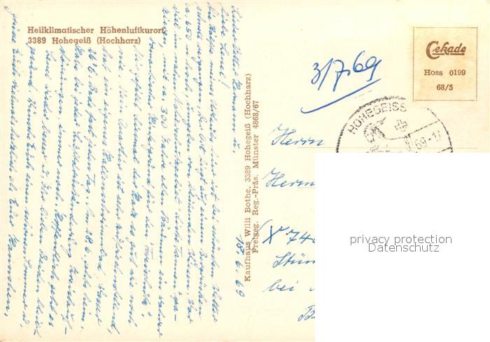 73110984 alte Postkarte Hohegeiss Harz Fliegeraufnahme postalisch gelaufen Erhaltung siehe scans [NatalD47] KatCode: 11110003153003