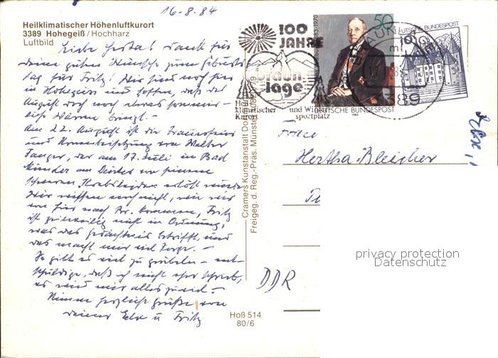 72608767 alte Postkarte Hohegeiss Harz Fliegeraufnahme postalisch gelaufen Erhaltung siehe scans [LiesaD40] KatCode: 11110003153003