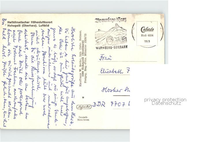 72078983 alte Postkarte Hohegeiss Harz Fliegeraufnahme postalisch gelaufen Erhaltung siehe scans KatCode: 11110003153003