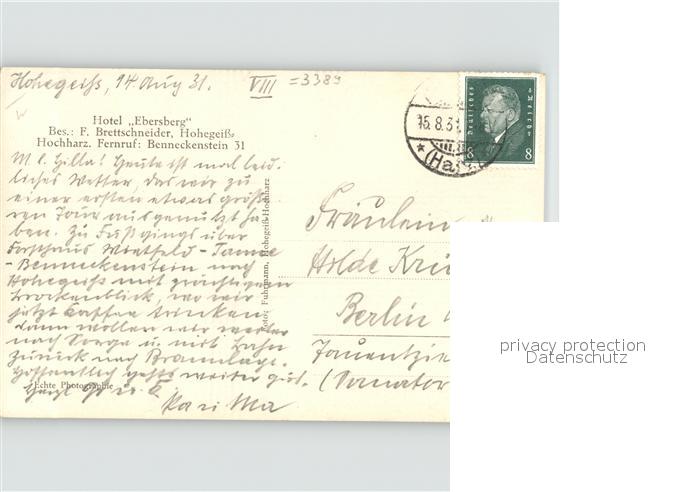 71719863 alte Postkarte Hohegeiss Harz Hotel Ebersberg Kurort postalisch gelaufen Erhaltung siehe scans KatCode: 11110003153003