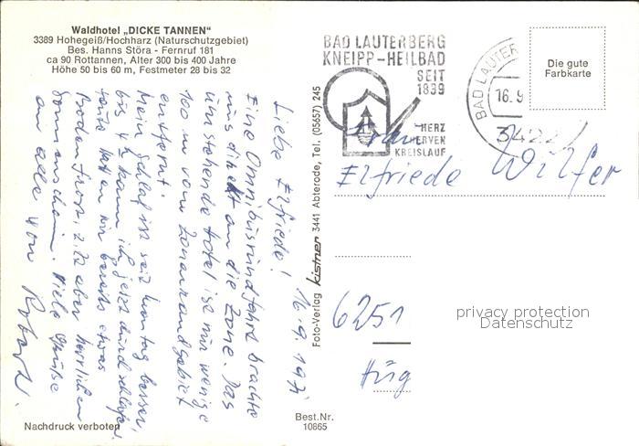 72111730 alte Postkarte Hohegeiss Harz Waldhotel Dicke Tannen postalisch gelaufen KatCode: 11110003153003