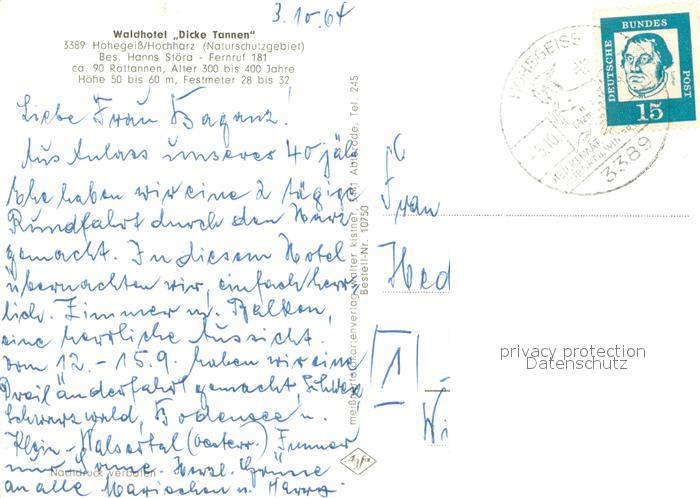 73615357 alte Postkarte Hohegeiss Harz Waldhotel Dicke Tannen Terrasse Gastraum postalisch gelaufen Erhaltung siehe scans [WerneD78] KatCode: 11110003153003