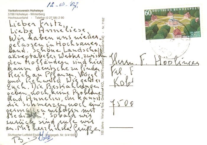 73942499 alte Postkarte Hoheleye Fliegeraufnahme mit Astenturm postalisch gelaufen Erhaltung siehe scans [WerneD78] KatCode: 11110005958048