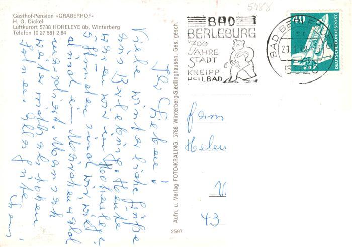 73942490 alte Postkarte Hoheleye Gasthof Pension Graberhof postalisch gelaufen Erhaltung siehe scans [WerneD78] KatCode: 11110005958048