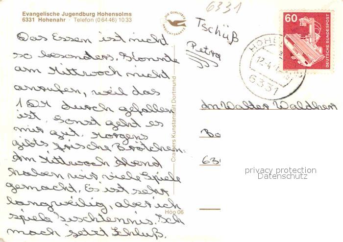 72886492 alte Postkarte Hohenahr Jugendburg Hohensolms Saal Rittersaal Kapelle Duerer postalisch gelaufen Erhaltung siehe scans [FriedD77] KatCode: 11110006532013