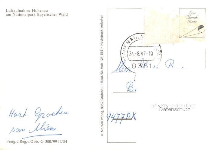 72958278 alte Postkarte Hohenau Niederbayern am Nationalpark Bayerischer Wald Fliegeraufnahme postalisch gelaufen Erhaltung siehe scans [FriedD77] KatCode: 11110009272127