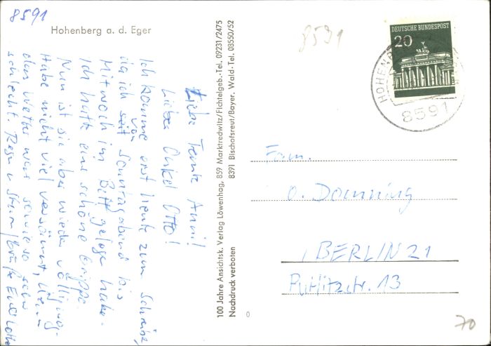 30726721 alte Postkarte Hohenberg Eger postalisch gelaufen KatCode: 11110009479127