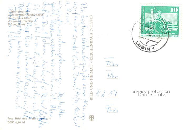 73868662 alte Postkarte Hohenbrueck-Neu Schadow Springbrunnen Freilichtbuehne und Kiosk Gasthaus Treue Neuendorfer See Bungalows postalisch gelaufen Erhaltung siehe scans [WerneD78] KatCode: 11110012061329