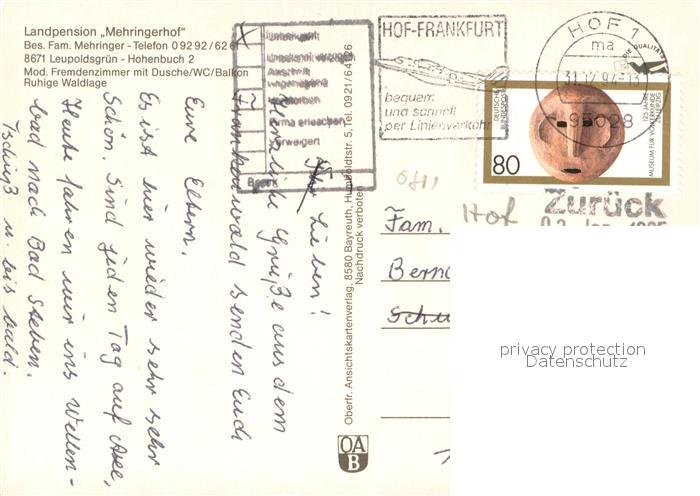 73659792 alte Postkarte Hohenbuch Leupoldsgruen Landpension Mehringerhof Fremdenzimmer Partie am Wasser Enten postalisch gelaufen Erhaltung siehe scans [FriedD77] KatCode: 11110009475145
