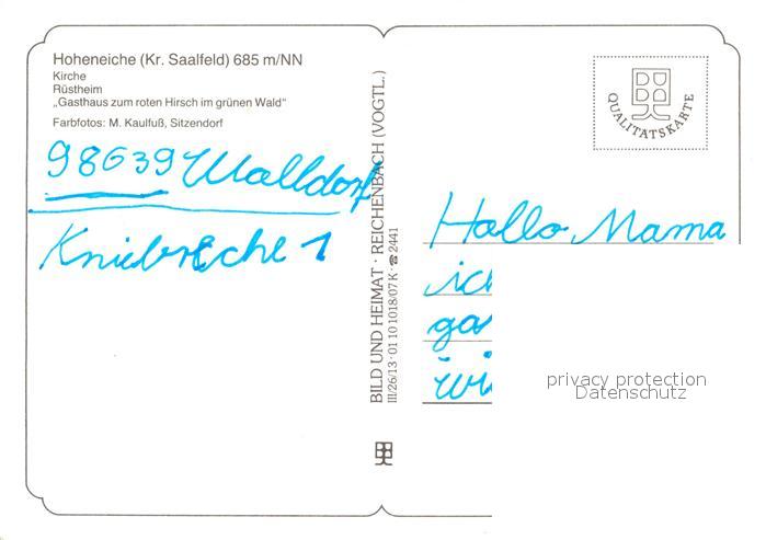 73569543 Hoheneiche Saalfeld Kirche Ruestheim Gasthaus zum roten Hirsch im gruenen Wald postalisch nicht gelaufen Erhaltung siehe scans [WerneD78] KatCode: 11110016073077