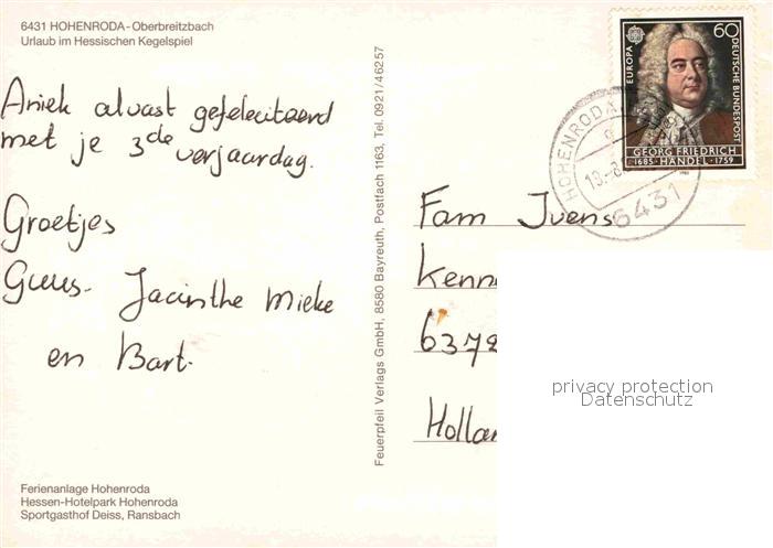 72845291 alte Postkarte Hohenroda Hessen Oberbreitzbach Ransbach Hessen-Hotelpark postalisch gelaufen Erhaltung siehe scans [NatalD47] KatCode: 11110006632010