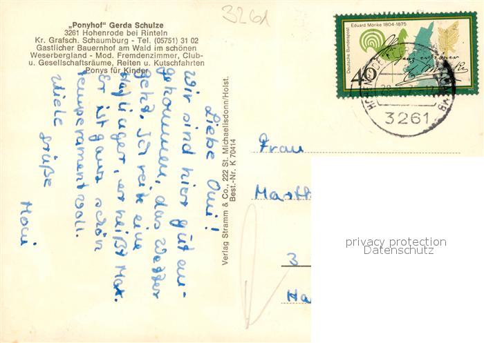 73086743 alte Postkarte Hohenrode Rinteln Ponyhof Gerda Schulze postalisch gelaufen Erhaltung siehe scans [NatalD47] KatCode: 11110003257031
