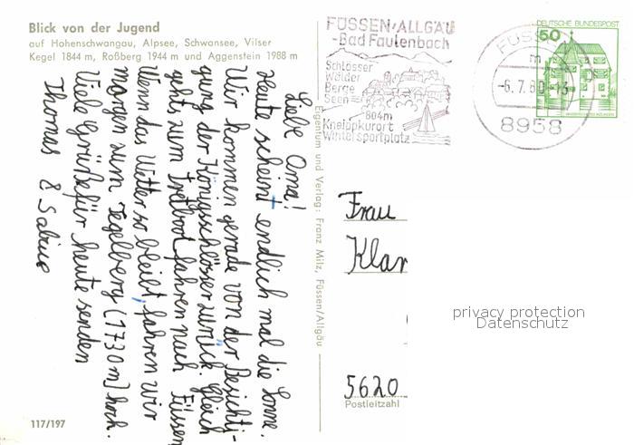 72760543 alte Postkarte Hohenschwangau Blick von der Jugend Alpsee Schwansee Vilser Kegel postalisch gelaufen Erhaltung siehe scans [LiesaD40] KatCode: 11110009777169