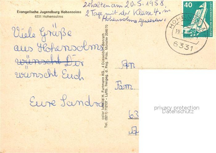 73147224 alte Postkarte Hohensolms Evangelische Jugendburg Fliegeraufnahme postalisch gelaufen Erhaltung siehe scans [FriedD77] KatCode: 11110006532013