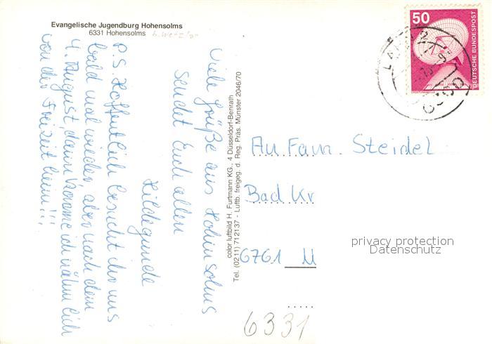 73321133 alte Postkarte Hohensolms Fliegeraufnahme Evangelische Jugendburg Hohensolms postalisch gelaufen Erhaltung siehe scans [KathaD81] KatCode: 11110006532013