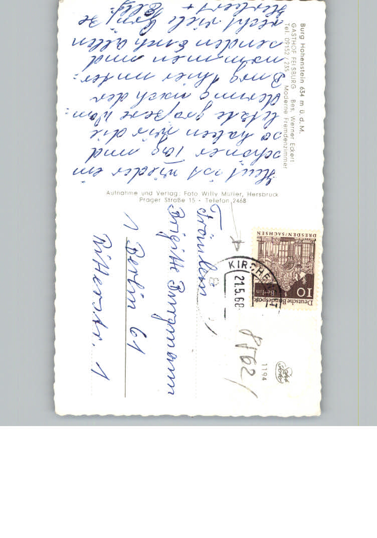 31162532 Hohenstein Burg 634m Kirchensittenbach Fraenkische Schweiz Bayern Gasthof Felsburg postalisch nicht gelaufen Alte Ansichtskarte Postkarte Katcode 11110014287160