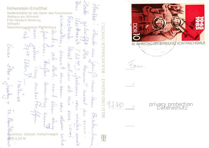 72972653 alte Postkarte Hohenstein-Ernstthal Gedenkstaette fuer die Opfer des Faschismus Rathaus Altmarkt Fritz Heckert Siedlung Naherholungsgebiet Pfaffenberg postalisch gelaufen Erhaltung siehe scans [FriedD77] KatCode: 11110014173100