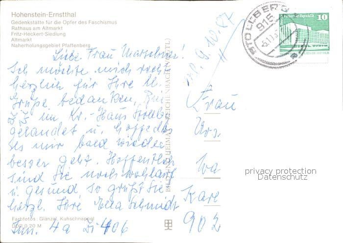 72375373 alte Postkarte Hohenstein-Ernstthal Gedenkstaette fuer Faschismusopfer Rathaus Altmarkt Fritz Heckert Siedlung Altmarkt Erholungszentrum Pfaffenberg postalisch gelaufen Erhaltung siehe scans KatCode: 11110014173100